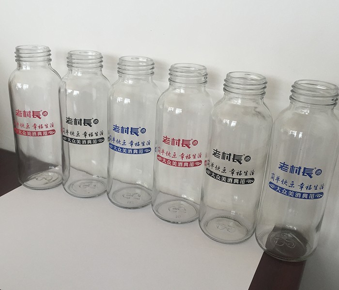 蒙砂酒瓶是在制品玻璃上,粘附一定大小面積的玻璃色釉粉,玻璃瓶廠經過580~600℃的高溫烘烤,使玻璃色釉涂層凝結在玻璃外表,并顯現出具有與玻璃主體不同顏色的一種裝飾辦法。粘附玻璃色釉粉,可用排筆涂刷,亦可用膠輥滾涂。經過絲印加工,能夠得到蒙砂面的樓空圖案。 其辦法是:在玻璃制品外表上,絲印一層由阻熔劑構成的圖案紋樣。